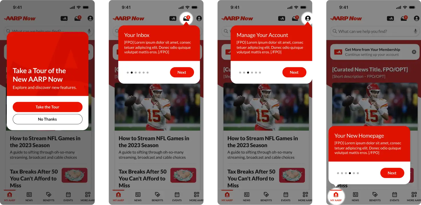 When the project was given the green light, it was decided AARP’s flagship app, AARP Now, would be the foundation for this new experience. As the lead UI designer on this project, I focused mainly on the interaction, animated set pieces and visual direction.