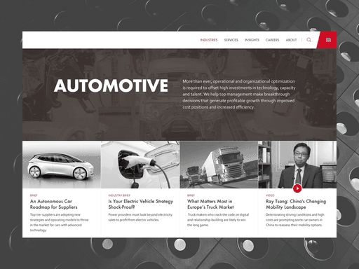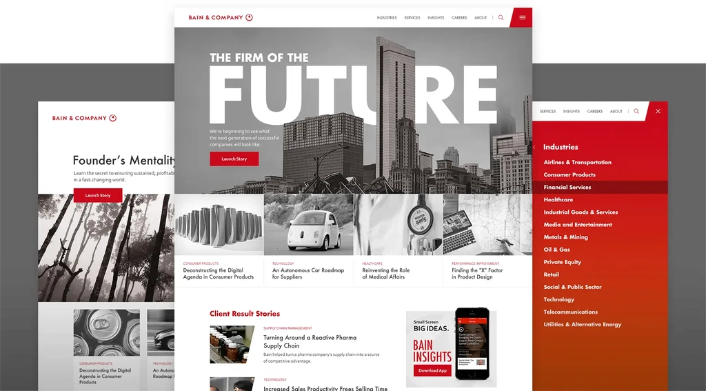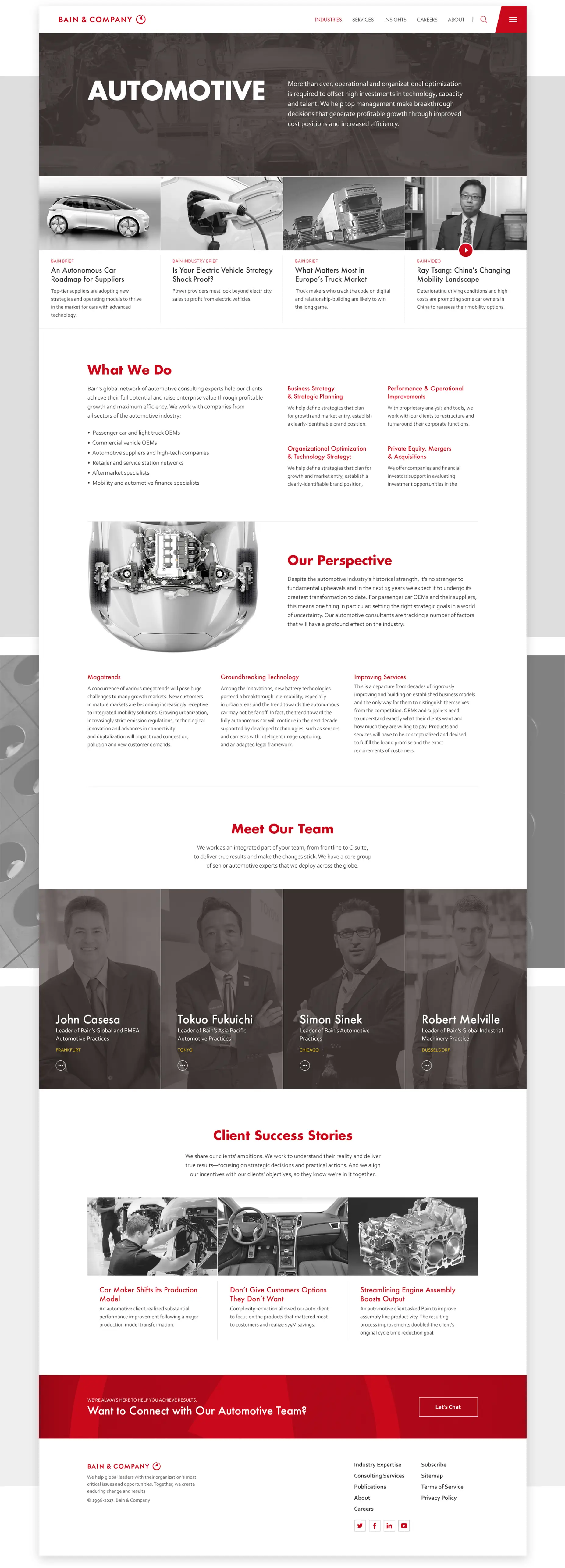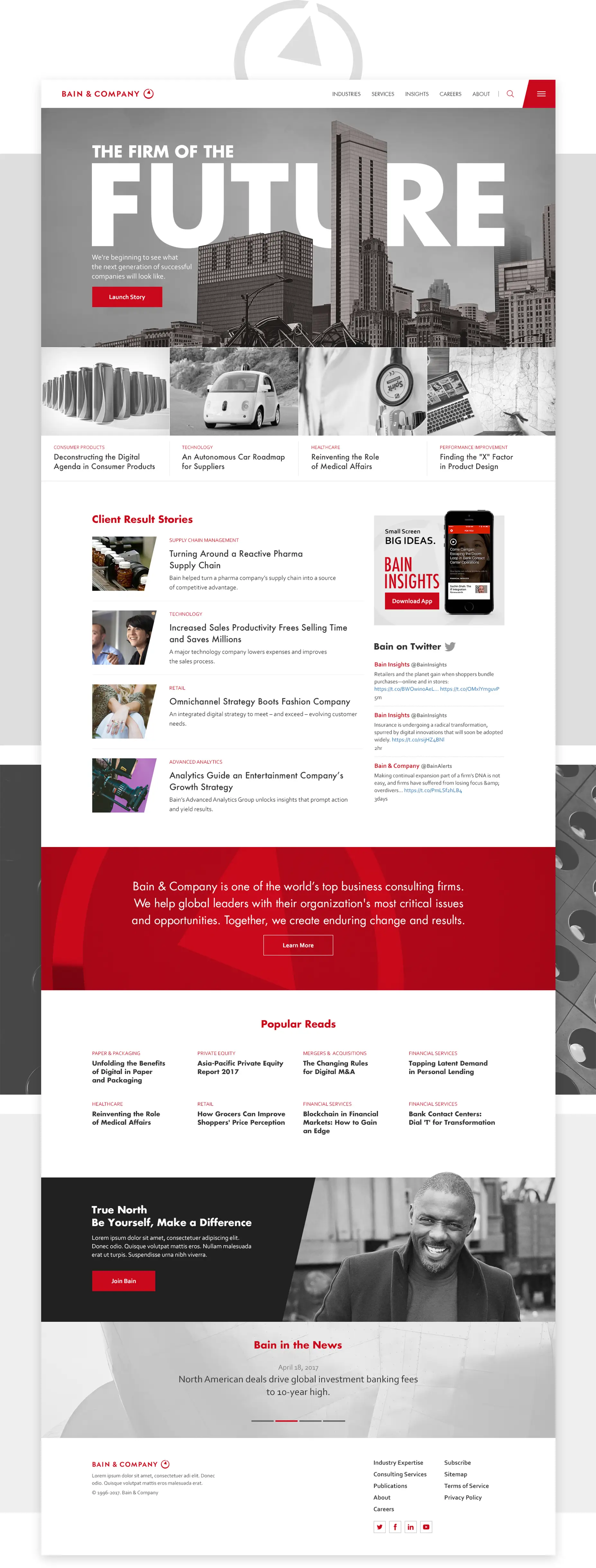 Bain & Company has always been a fantastic client. I was apart of their initial redesign in 2011 as a front-end developer, then again in 2014 as a designer during the "responsive design boom." Each project went off without a hitch. When I heard they were considering Siteworx for their next big overhaul, I was all in. To assist with the pitch work, I put together a few concepts that would ultimately help win the project.