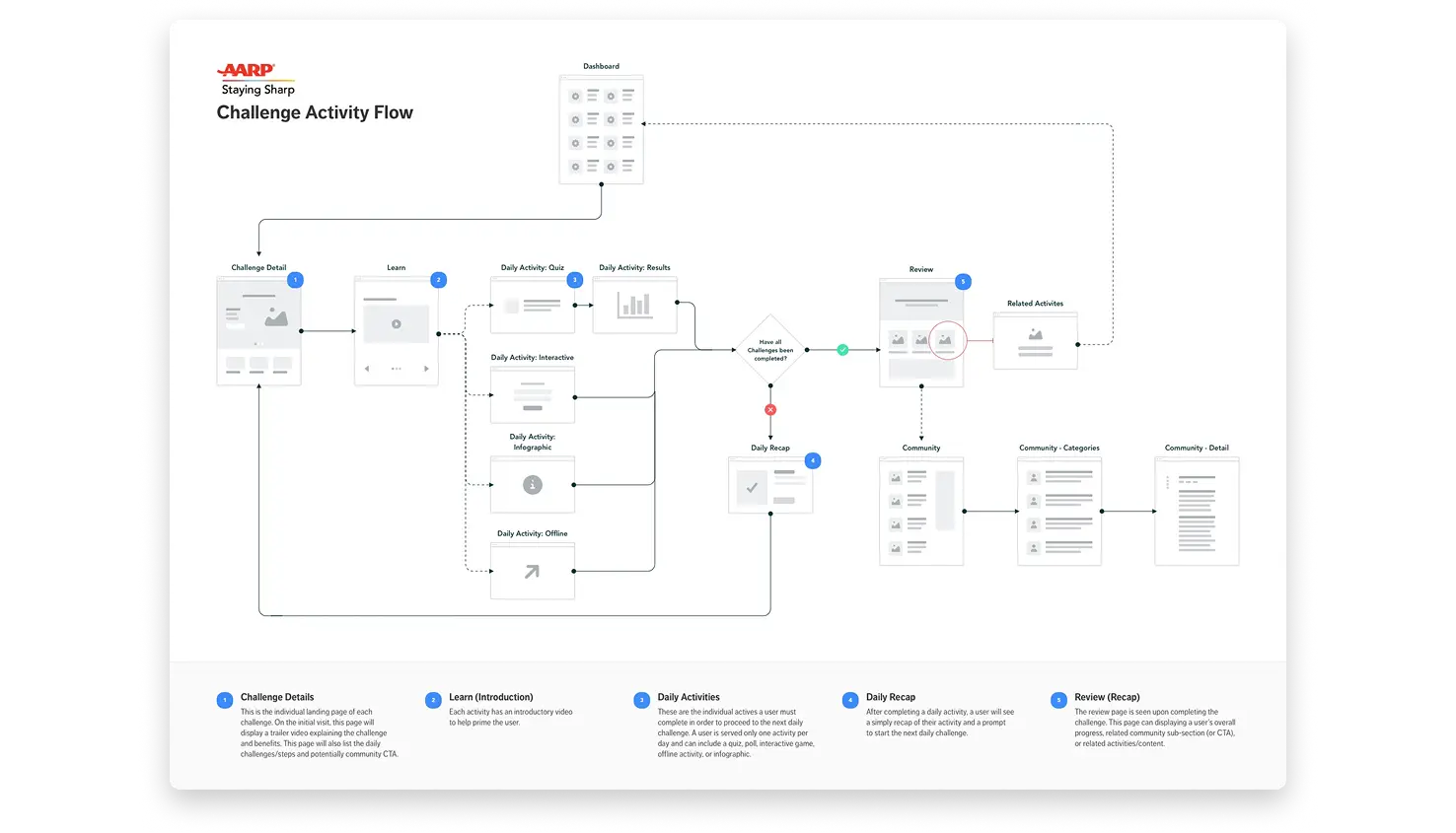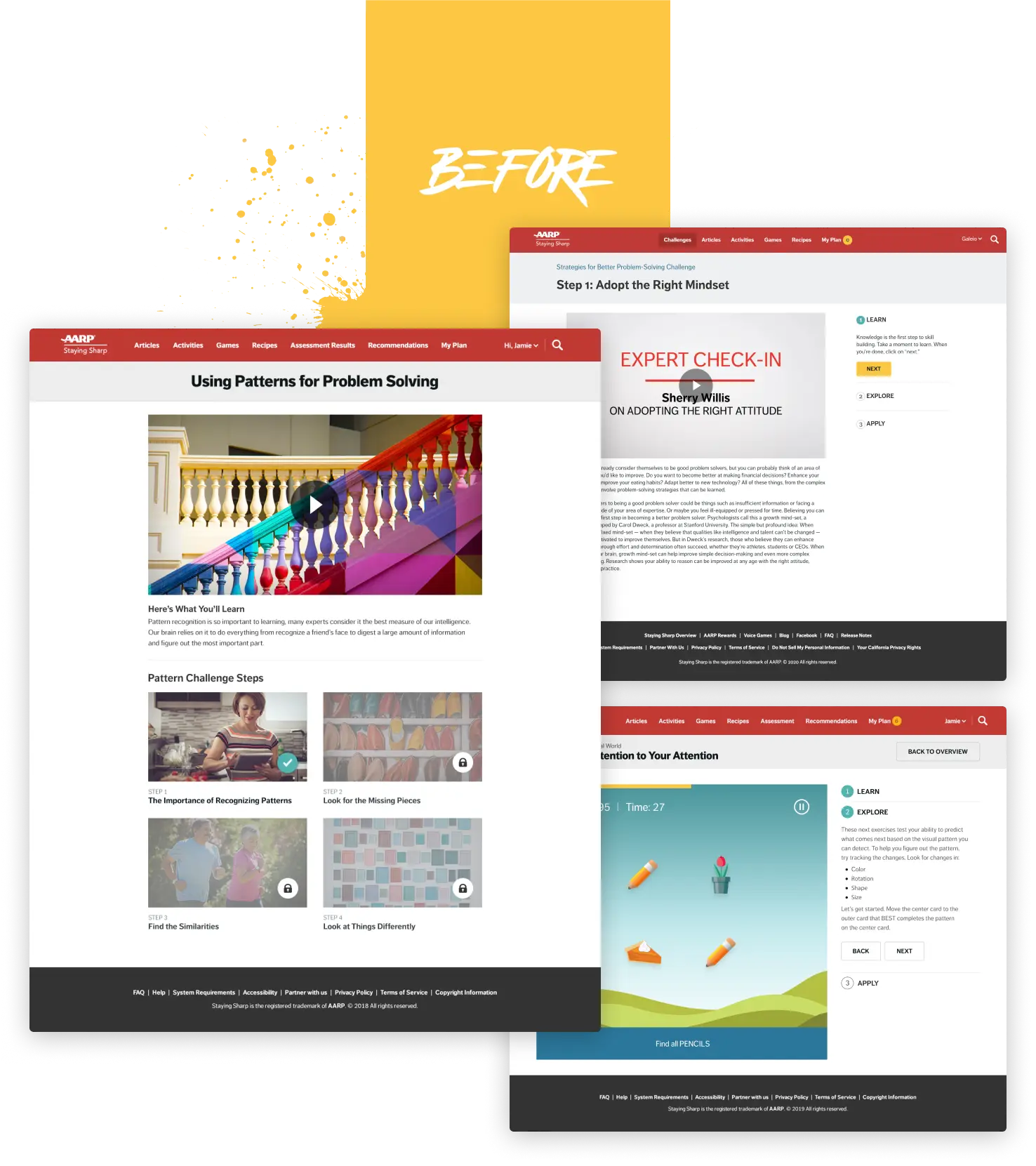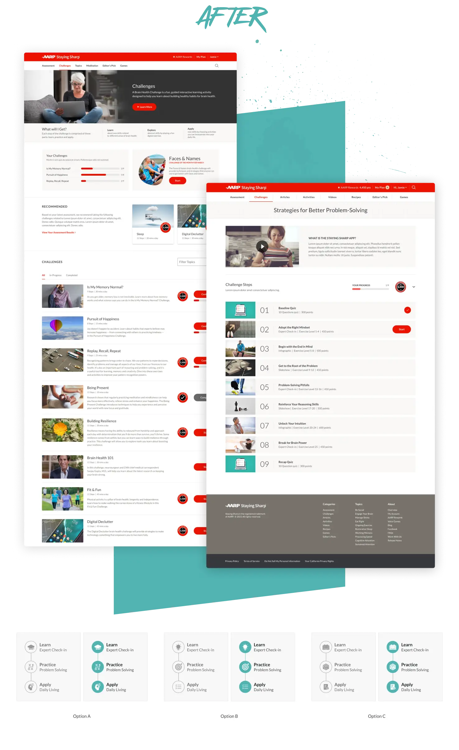 Challenges are a core program of AARP Staying Sharp. It's a combination of videos, games and guided activities to help users develop healthy habits for a better lifestyle. Over time, the original design became too rigid to keep up with ever-evolving business requirements. Plus, the Staying Sharp team had concerns about the experience being too text-heavy. My task was to completely revamp Staying Sharp Challenges. I was able to deliver a new experience that was flexible, intuitive and most importantly increased engagement with users.