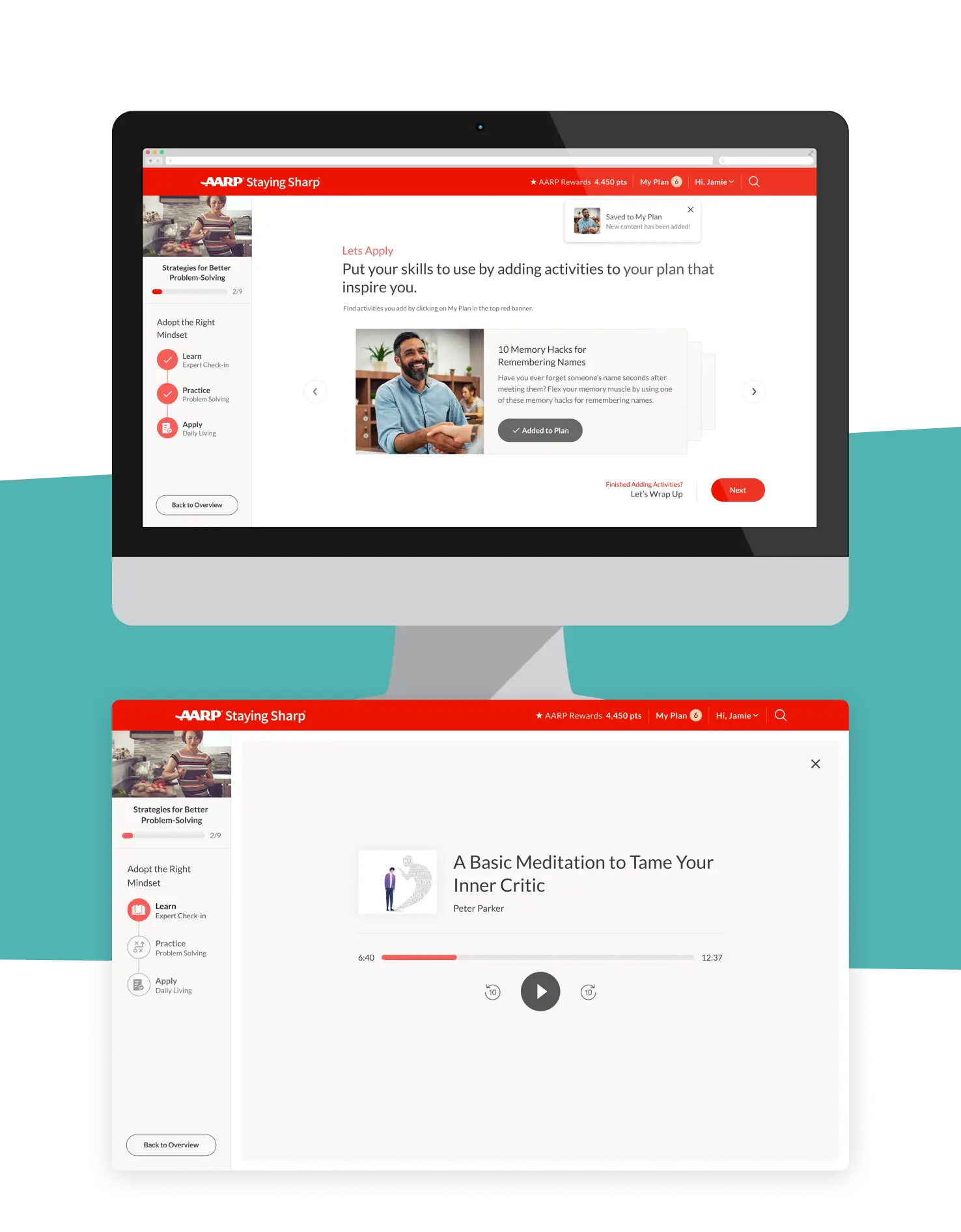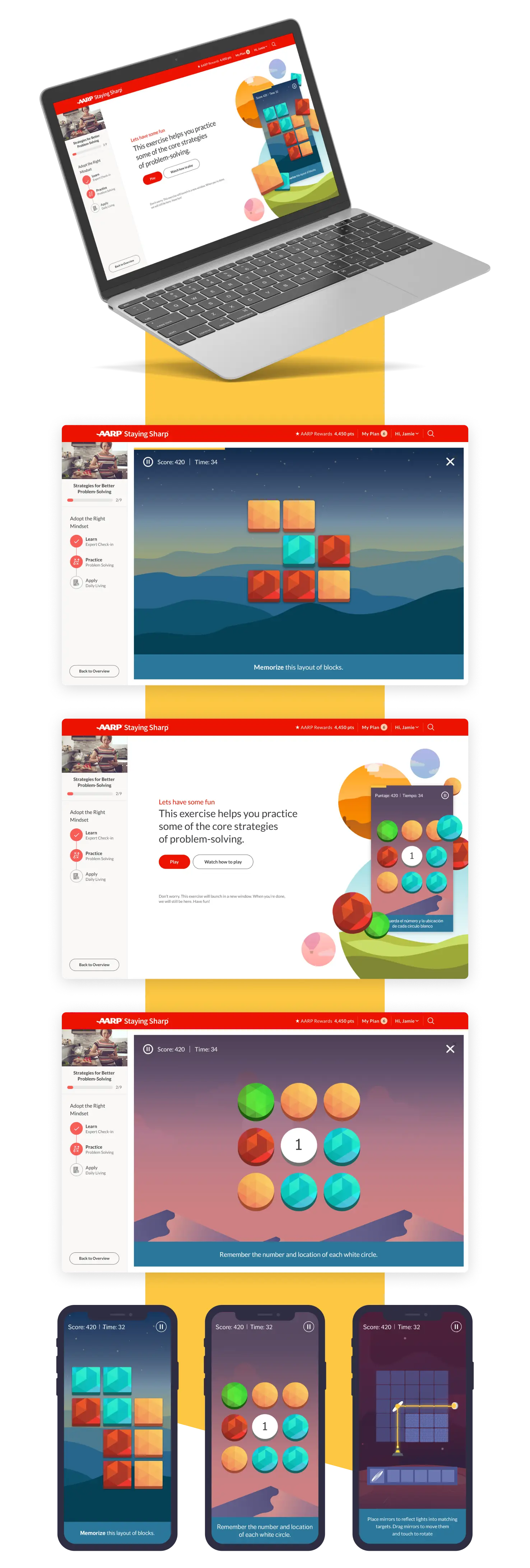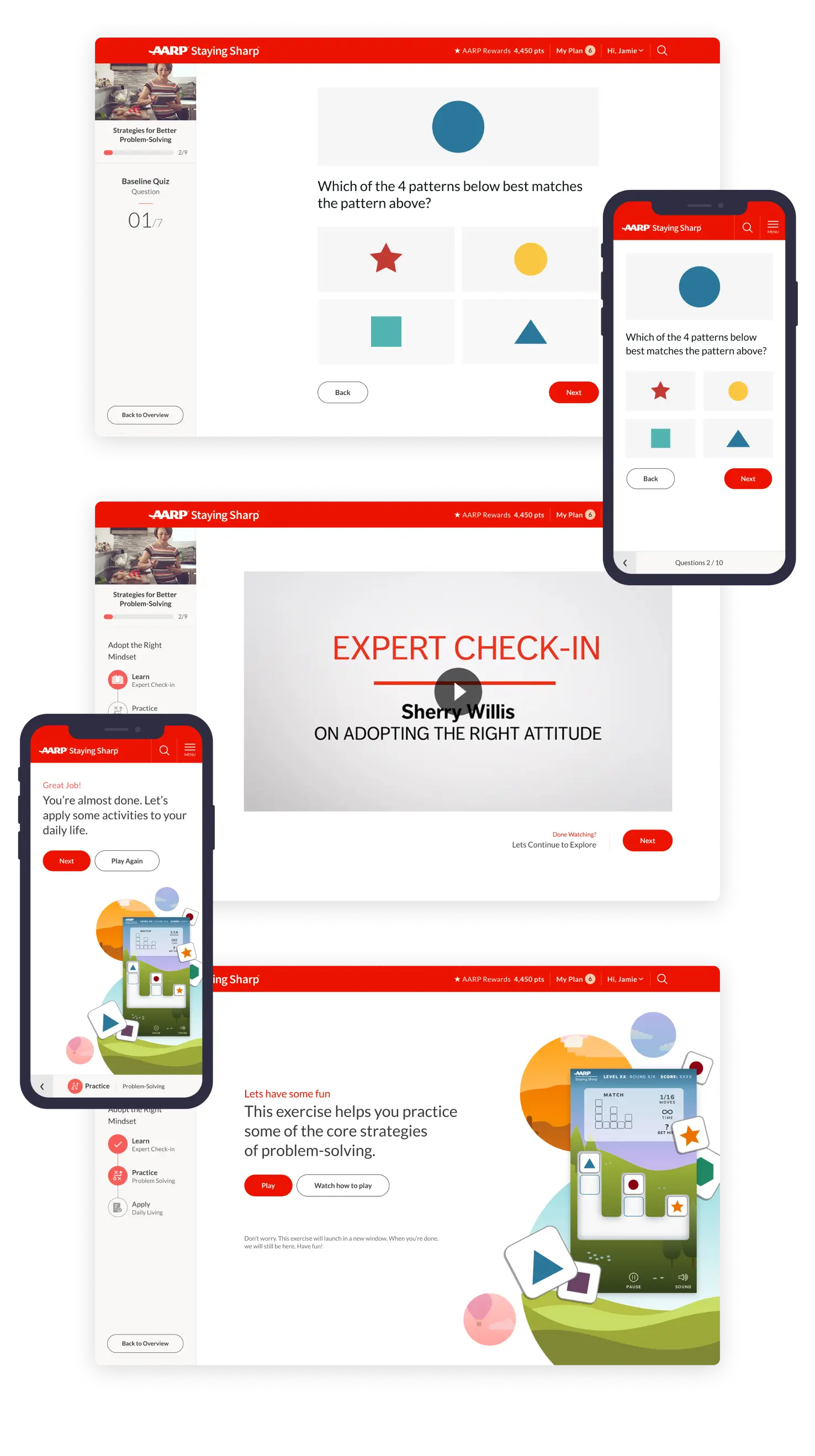 Challenges are a core program of AARP Staying Sharp. It's a combination of videos, games and guided activities to help users develop healthy habits for a better lifestyle. Over time, the original design became too rigid to keep up with ever-evolving business requirements. Plus, the Staying Sharp team had concerns about the experience being too text-heavy. My task was to completely revamp Staying Sharp Challenges. I was able to deliver a new experience that was flexible, intuitive and most importantly increased engagement with users.