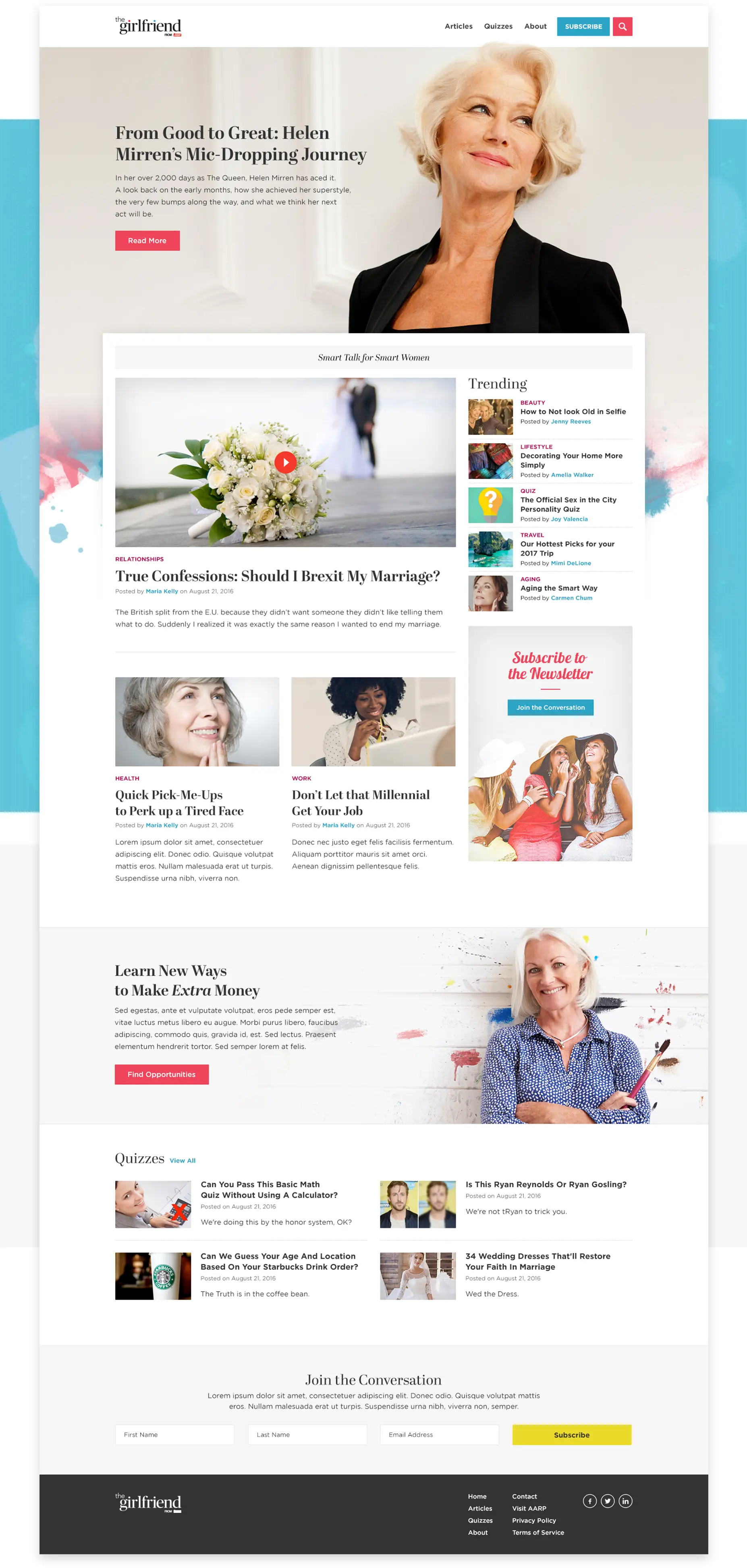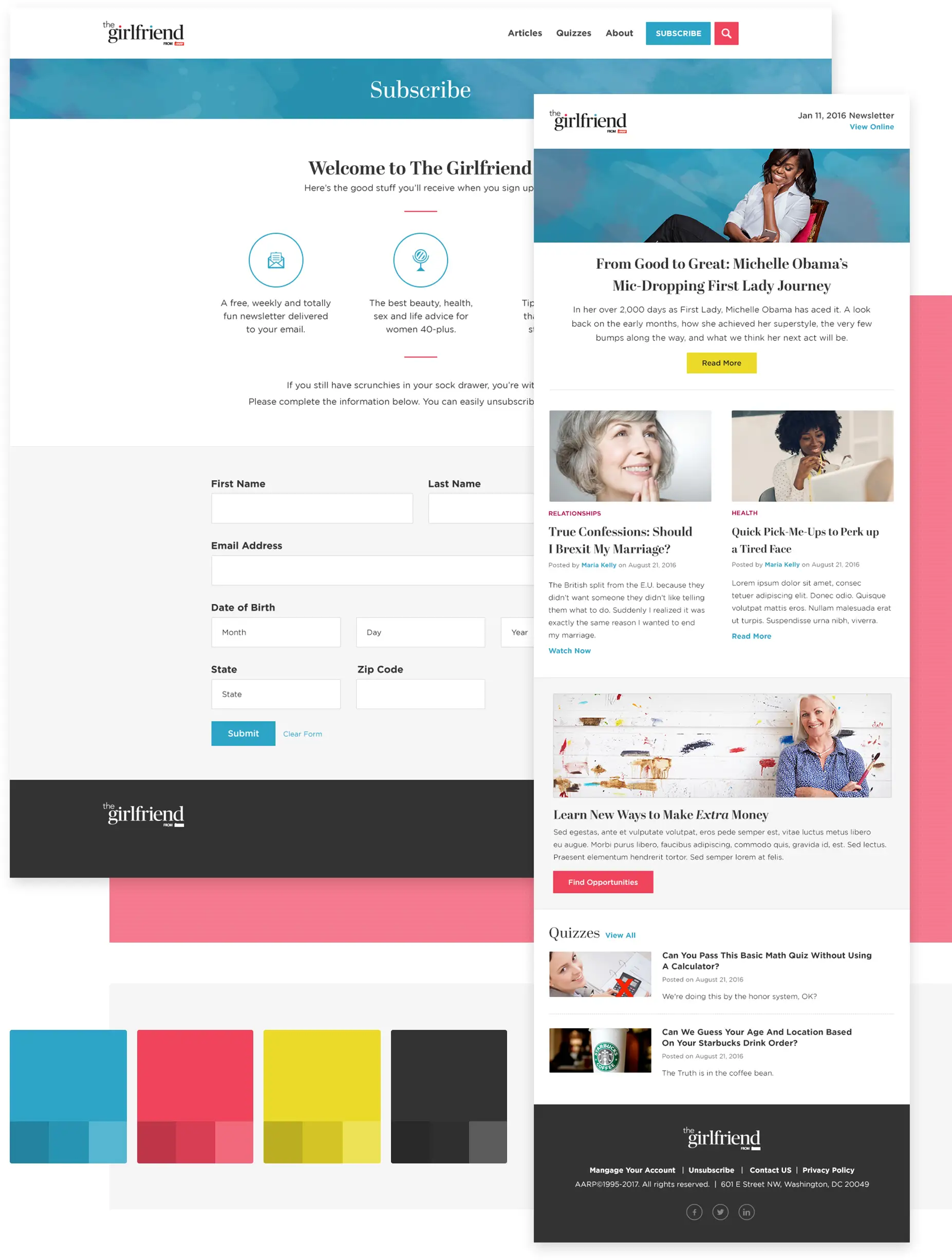 Managed by AARP's editorial team, The Girlfriend is a weekly digital newsletter for women over 40. It's written from a "girlfriends" perspective and covers topics related to health, work, lifestyle and relationships. It's original design was heavily dated and lack an online repository. While at Siteworx, I was tasked with creating a fresh and vibrant landing page to elevate the brand and bring it into the modern era.
